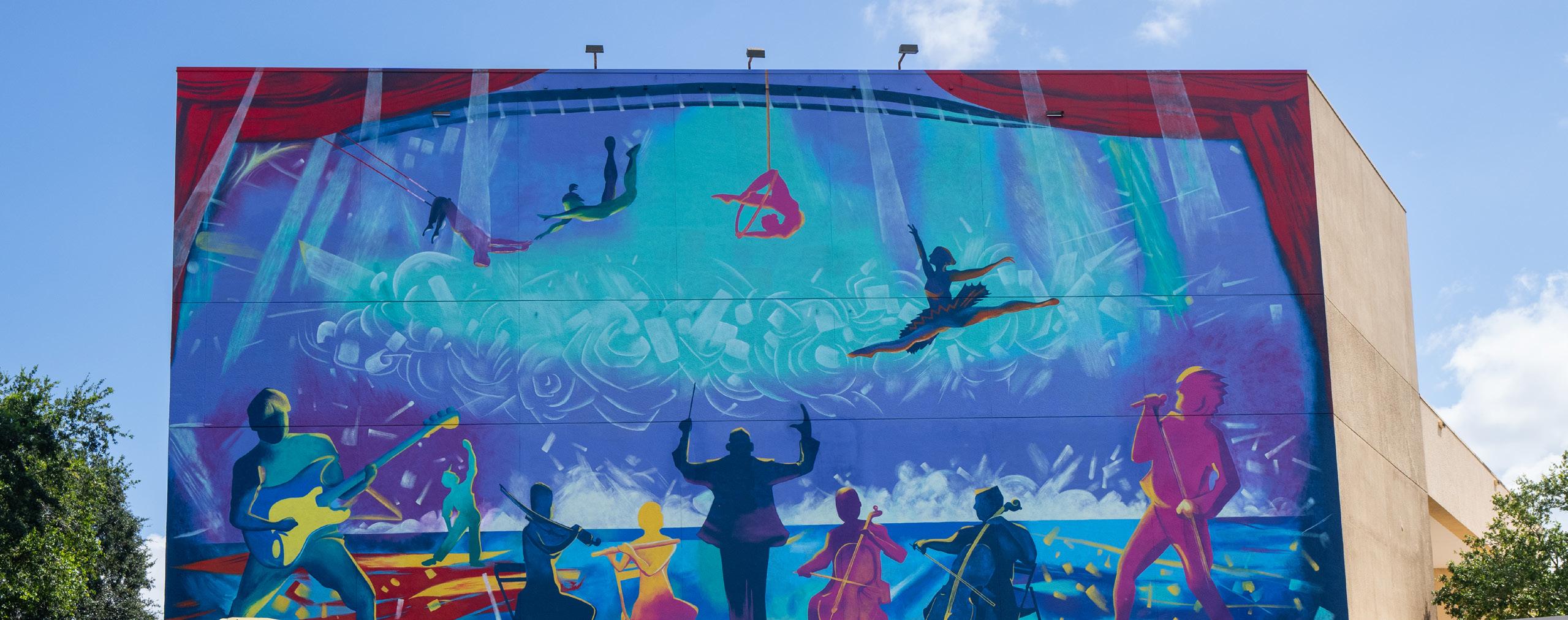 The mural “TRAILS of Expression” by Vito Di Bari is now complete at the Coral Springs Center for the Arts. In TRAILS of Expression, the artistic aim is to pay homage to the Center for the Arts by showcasing a vibrant celebration of various art forms housed within the venue. Each artistic figure represented in the mural is carefully chosen