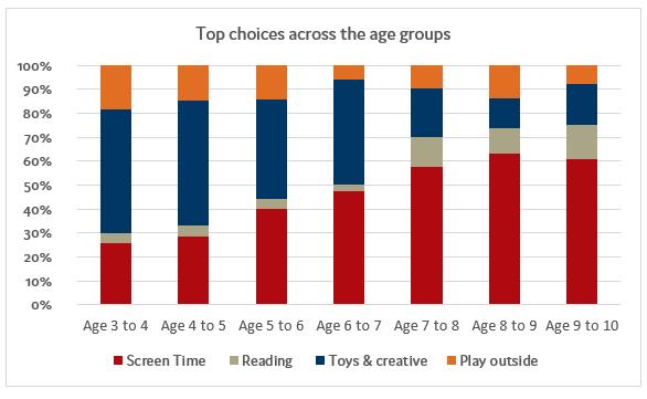 Although we can apply a level of expectation that reading was less likely to be the top choice for children, we would hope that it featured within the top three choices of ways to spend time. However, we found that reading is also the least likely activity to be ranked within the top three choices for children
