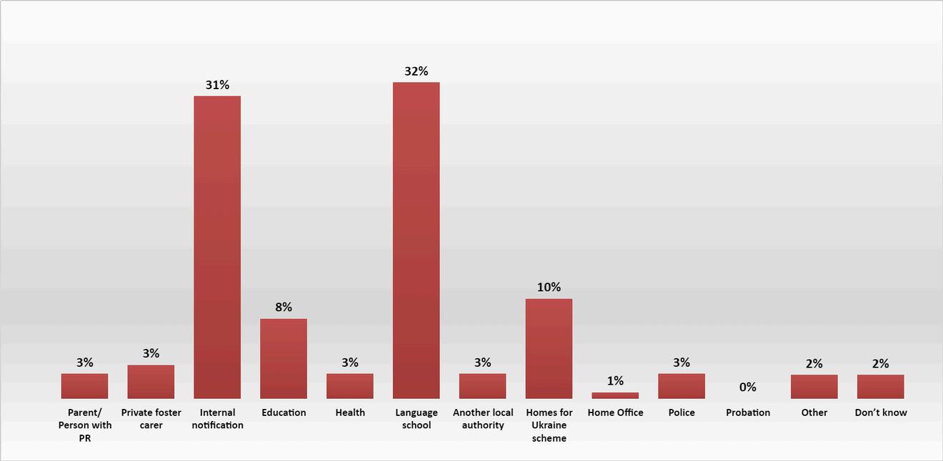 Notifications came from a range of sources with most being internal from other children’s teams (31%), although there are a significant number of notifications from language schools (32%). Interestingly, very few came from parents or private foster carers themselves. This supports the hypothesis that we need to continue to raise awareness of private fostering.