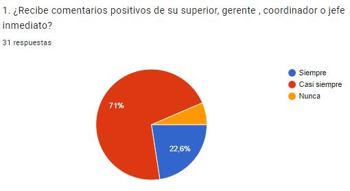 El 71% de los docentes señalan que "casi siempre" reciben comentarios positivos de su jefe, por lo que la motivación es un factor estable en la organización, pero podría mejorar si estos elogios llegan de forma conseutiva.