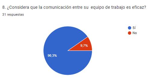 El 90.3% de los docentes mencionan que la comunicación con su equipo de trabajo "sí" es eficaz y ayuda mucho en la realización de tareas a cumplir.