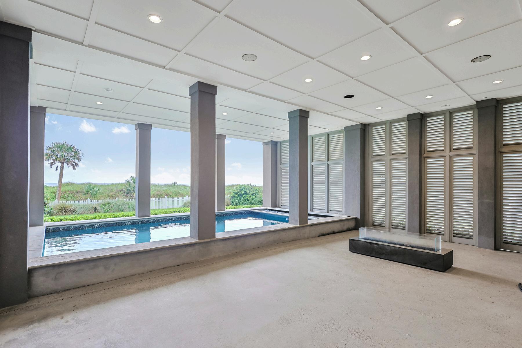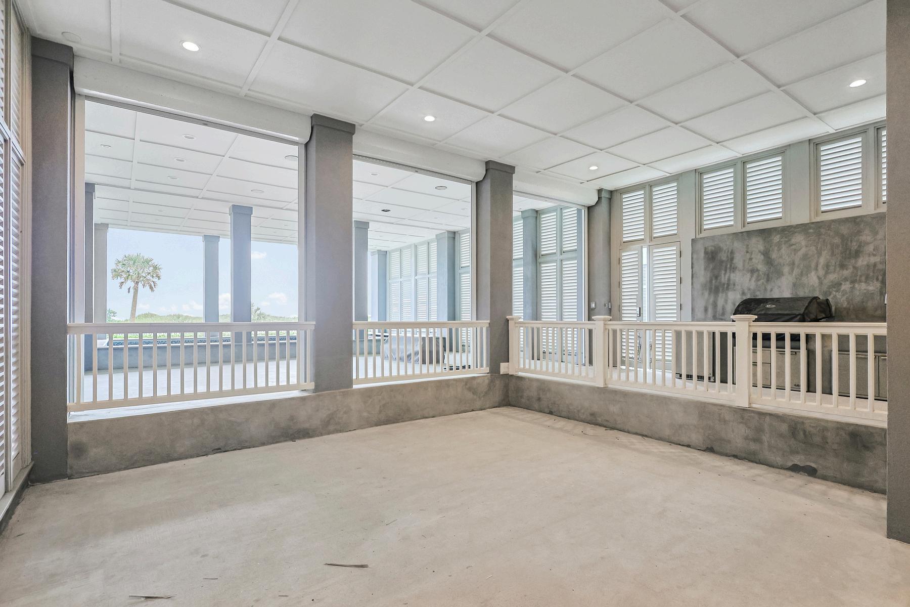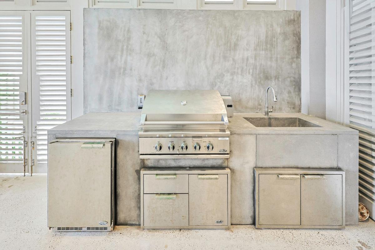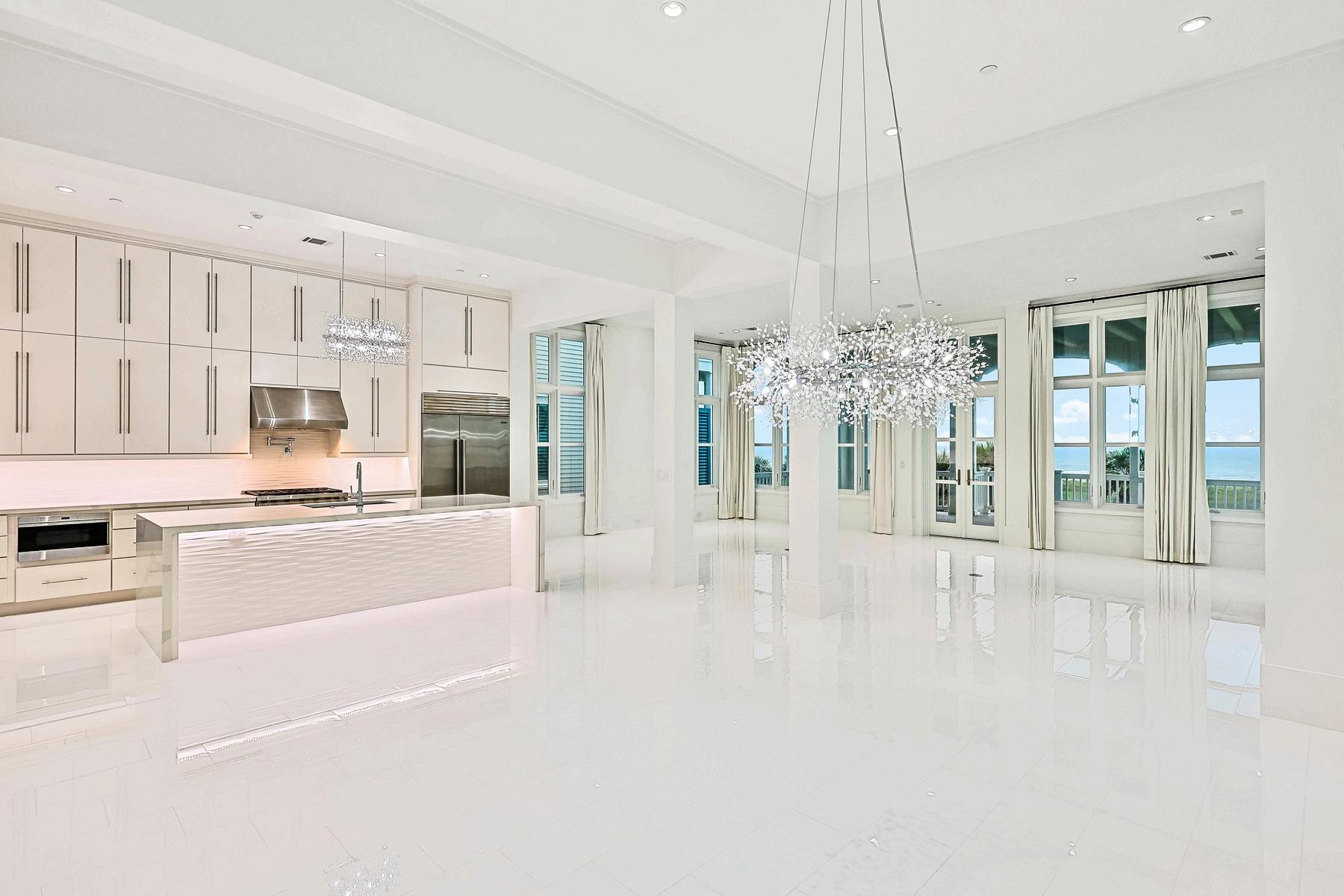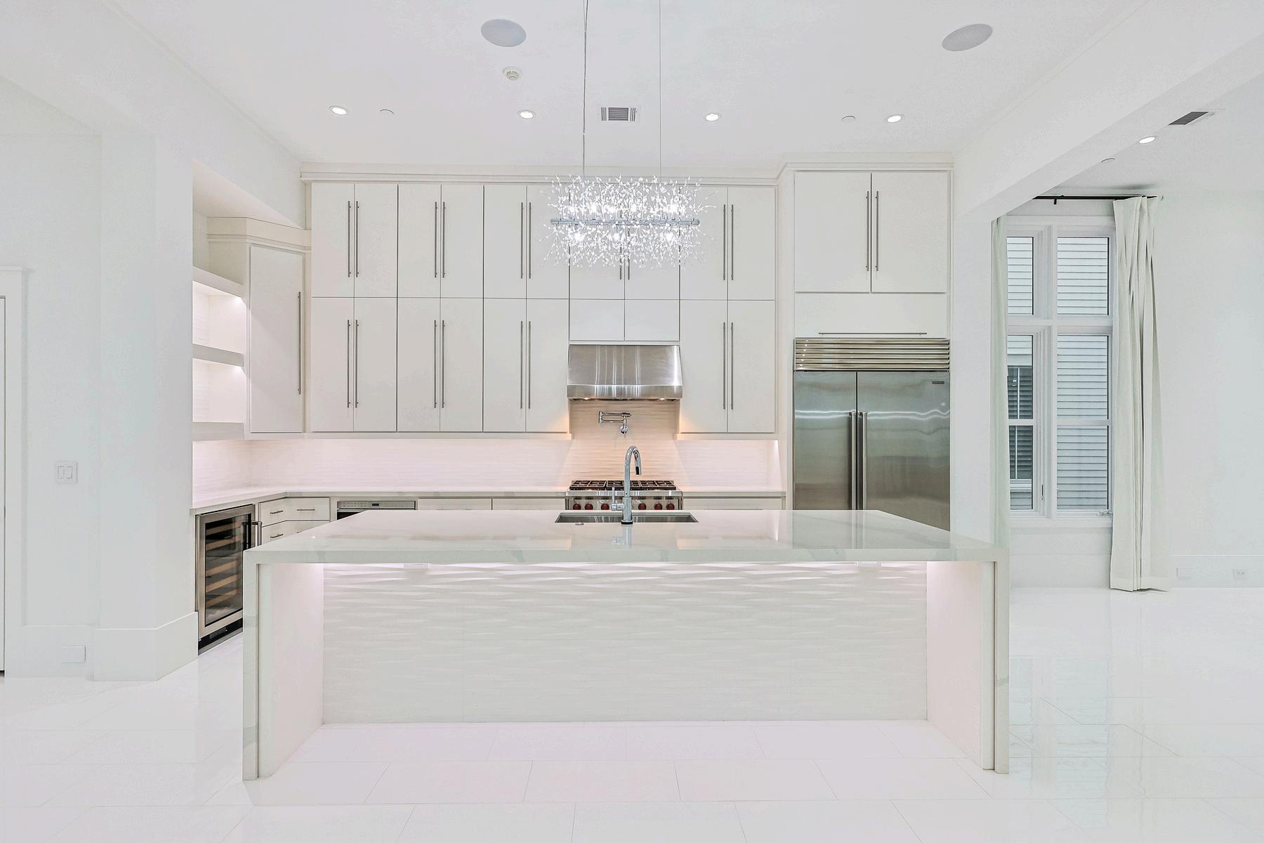 The designer kitchen is a culinary dream, anchored by a quartzite waterfall-edge island, Sub-Zero and Wolf appliances, and custom cabinetry that offers both style and storage Whether you're hosting intimate dinners or large gatherings, the seamless layout, integrated sound system, and exquisite lighting elevate every moment Just steps away, the grand beachfront porch extends your living space to the sea breeze and sunshine