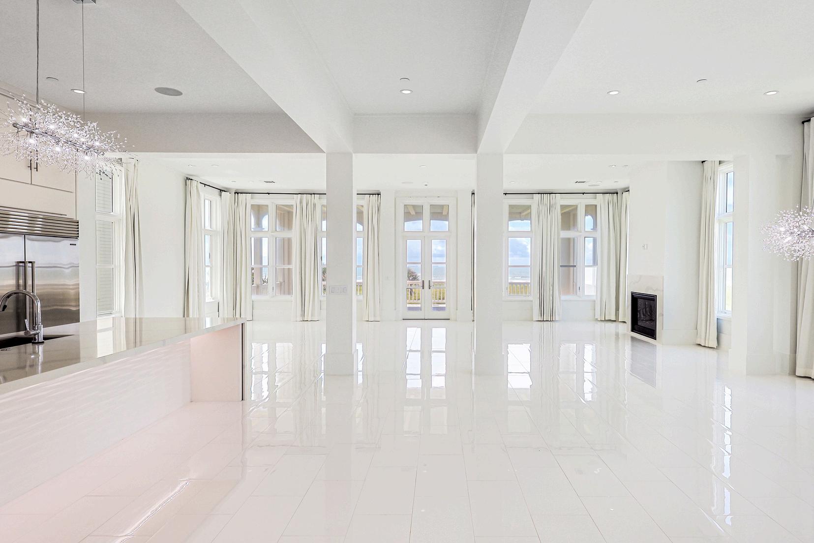 This breathtaking open-concept living and kitchen space is the heart of the home, where coastal sophistication meets everyday comfort. Soaring 13-foot ceilings and walls of windows frame uninterrupted Gulf views, filling the space with natural light and an effortless indoor-outdoor flow The living room features a sleek gas fireplace and custom silk drapery that adds a refined touch, while pristine white tile flooring grounds the space in clean, chic contemporary style.