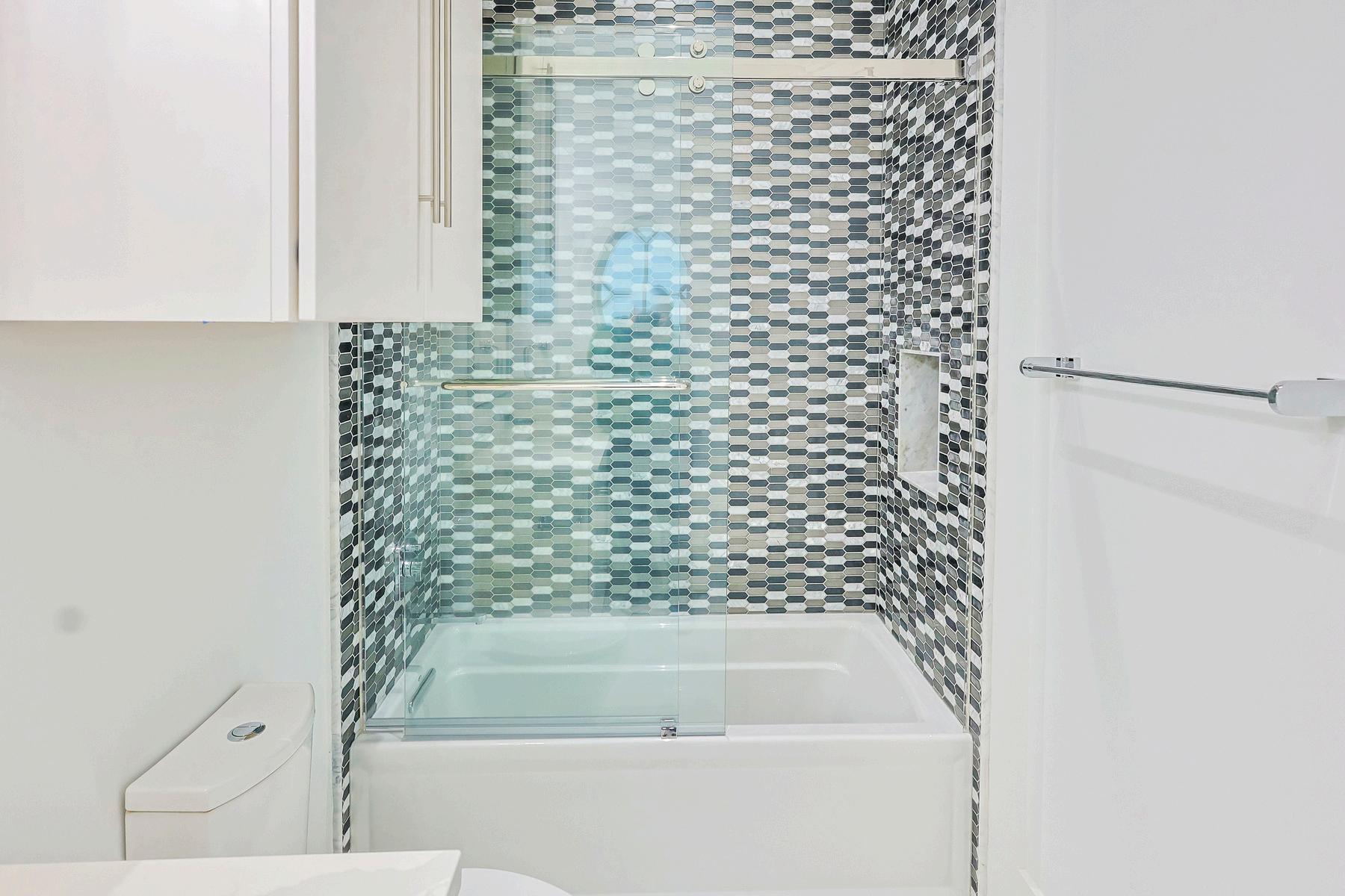 Designer tilework and soaking tub in primary ensuite