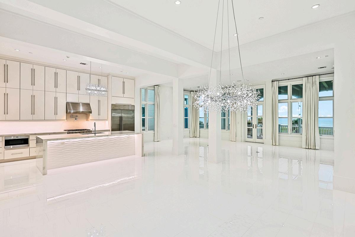 This breathtaking open-concept living and kitchen space is the heart of the home, where coastal sophistication meets everyday comfort Soaring 13-foot ceilings and walls of windowsframeuninterruptedGulfviews,fillingthespacewithnaturallightandaneffortless indoor-outdoor flow. The living room features a sleek gas fireplace and custom silk drapery that adds a refined touch, while wide-plank flooring grounds the space in warmth and elegance