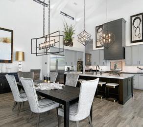 with luxurious finishes. “Again, we wanted that modernized Old World feel,” said Brittany. “So, we paired contrasting elements like the traditional stone range hood with the more modern pendant chandeliers over the island.” The kitchen includes Taj Mahal Quartzite counters, two-tone cabinetry and Brizo fixtures in Champagne Bronze. Additionally, there is a caterer’s kitchen for more prep and storage space, including unique features like wire mesh cabinets and even a sliding ladder.