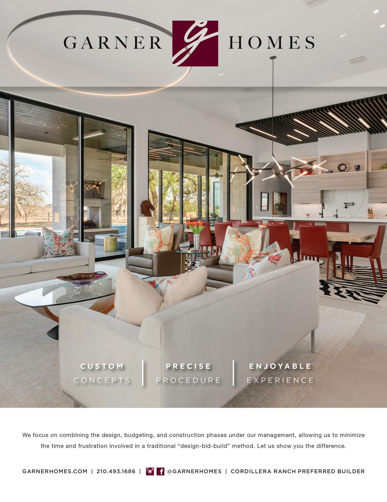 Cordillera Ranch Living is published bi-monthly through a joint venture between Cordillera Ranch Development Corporation and Traveling Blender, LLC. No reproduction in any form is authorized without the consent of both Cordillera Ranch Development Corporation and Traveling Blender, LLC. Cordillera Ranch Living is a registered trademark of Cordillera Ranch Development Corporation. 28 Cordillera Trace, Boerne, Texas 78006. Printed in the USA. All rights reserved 2023. No responsibility is assumed for unsolicited submissions. Manuscripts, photographs, and other submitted material can be acknowledged or returned if accompanied by a self-addressed, stamped envelope. The content contained does not necessarily reflect the opinions and views of Cordillera Ranch Development Corporation, Traveling Blender, LLC, or Cordillera Ranch residents. Cordillera Ranch Development Corporation and Traveling Blender, LLC assumes no liability for misinformation, omissions, or errors.