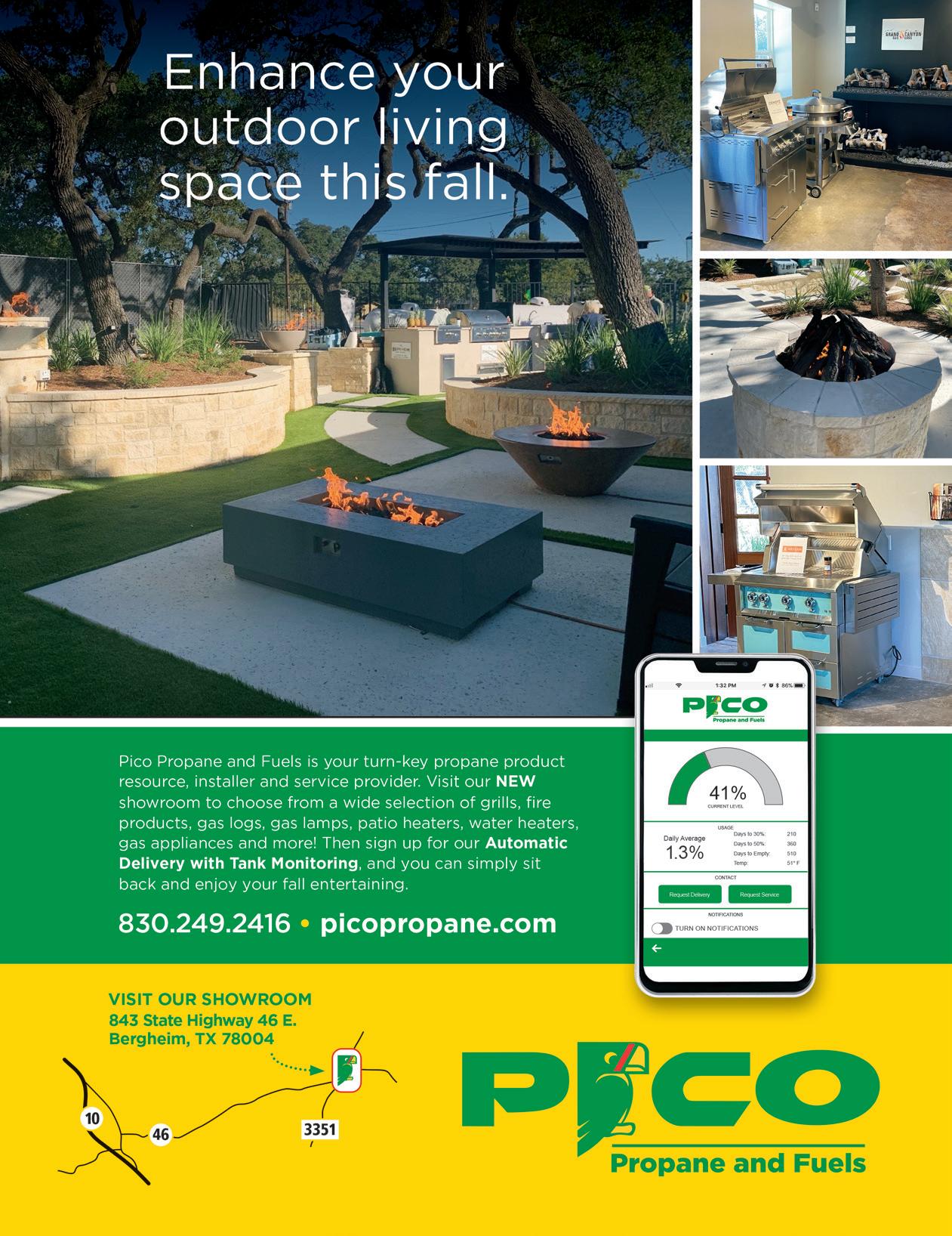 FOR ALL YOUR LANDSCAPE & MAINTENANCE NEEDS Lawn and Landscape Maintenance Landscape Installation • Tree Trimming Irrigation Installation and Repair All Types of Brush Removal Custom Outdoor Living Areas Outdoor Kitchens • Outdoor Fireplaces Fire Pits • All Types of Flagstone Patios All Types of Fencing 201 A HIGHWAY 46 EAST, BOERNE, TX ZANE PRICE • 830.331.8781 • zane@greenspace-tx.com greenspace-tx.com