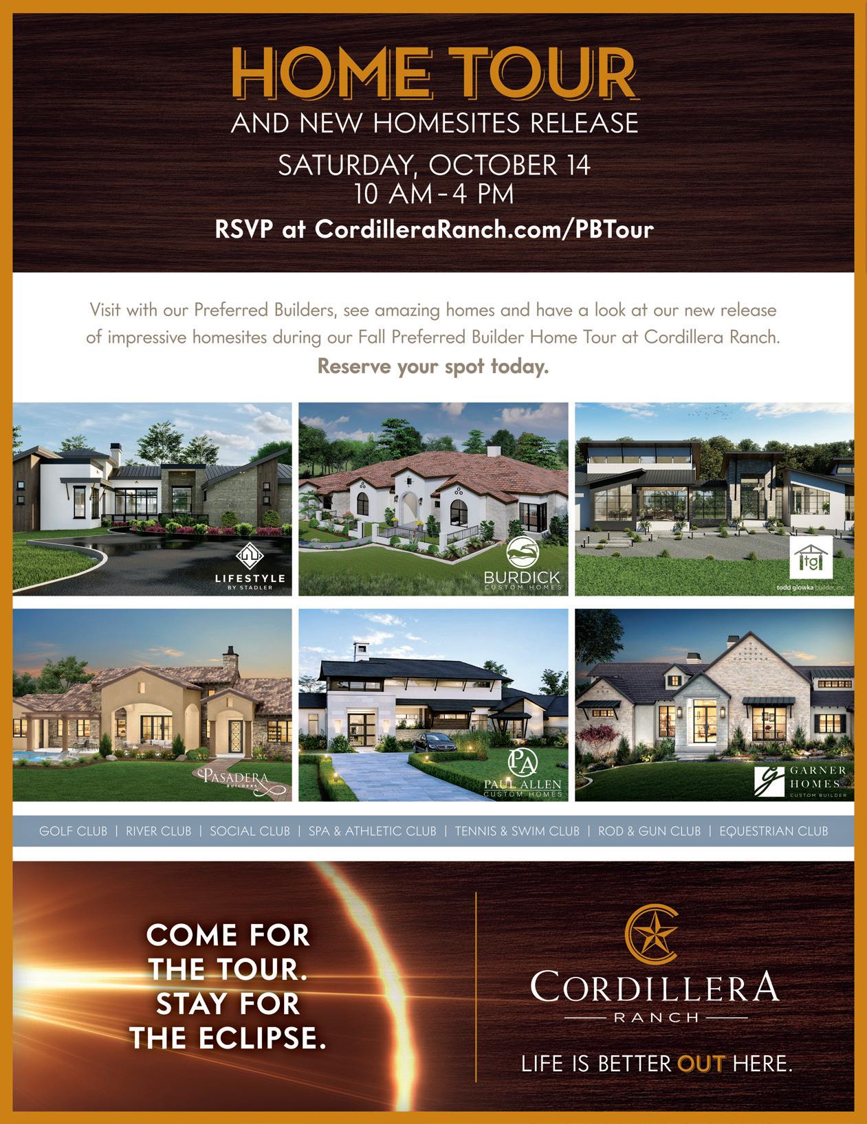 It’s recommended that you RSVP for the Preferred Builders Tour at https://cordilleraranch.com/pbtour/ or by calling us at 830.336.3570. This will allow you to receive important updates and news about the upcoming event.