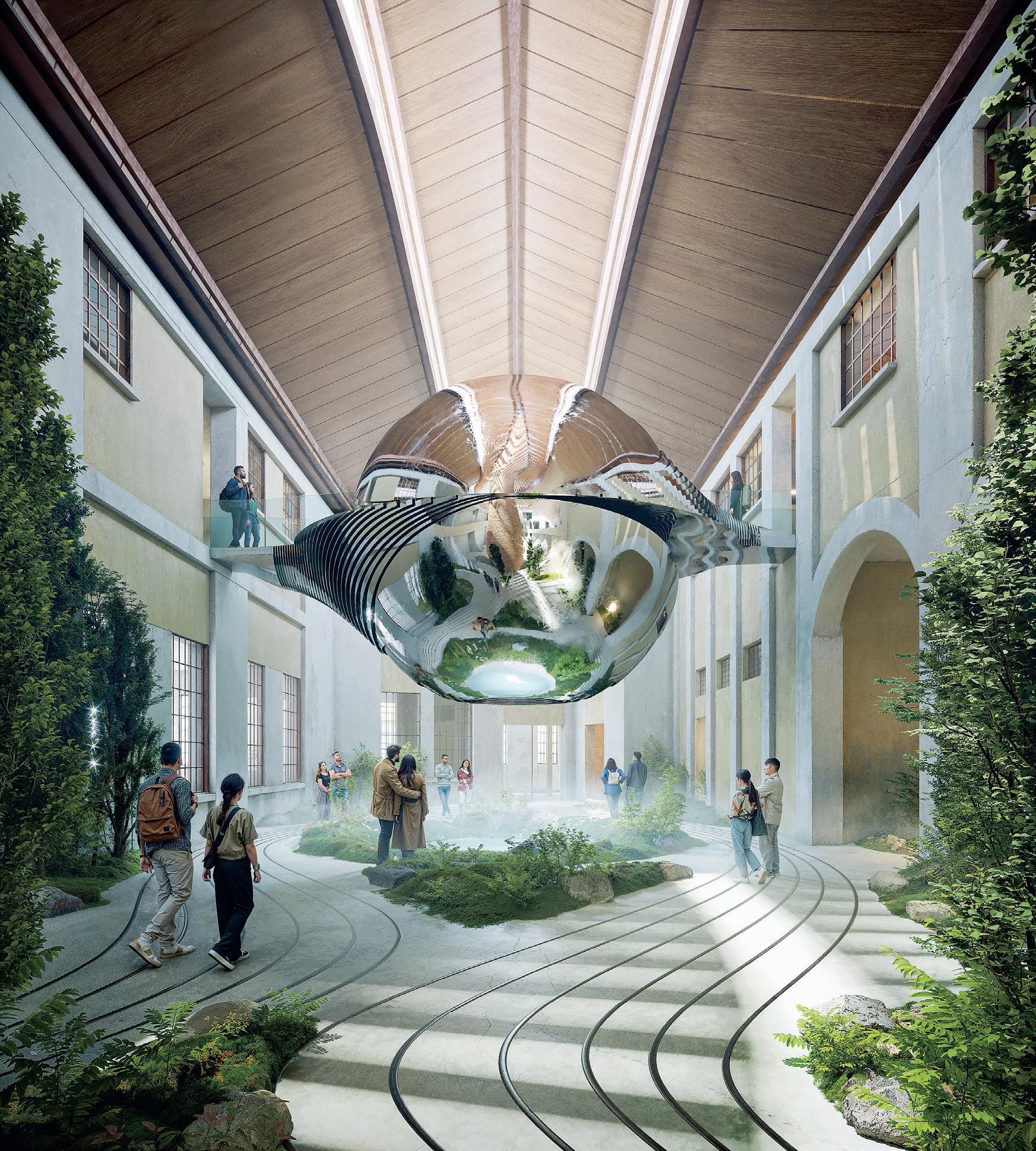 The Tesla Electronic Transformer Gallery is shaped by continuous flows of curves, inspired by the dynamic energy of magnetic fields. The journey culminates in the Tesla Memorial—a surreal, reflective, suspended sphere that houses Tesla’s ashes - offering a contemplative and poetic conclusion to the museum experience.