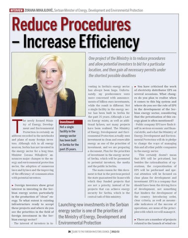 Launching new investments in the Serbian energy sector is one of the priorities of the Ministry of Energy, Development and Environmental Protection 26 Guide to the Foreign Investors Council 2012/13