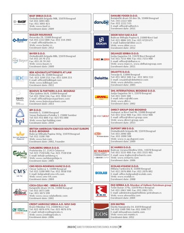 EKO SERBIA A.D. Member of Hellenic Petroleum group Tošin bunar 274a, 11070 Novi Beograd Tel: 011 2061 500; Fax: 011 2061 555 E-mail: administracija@hellenic-petroleum.rs Web: www.ekoserbia.com Enrolment date: 2004