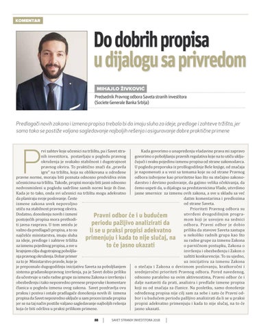 Kada govorimo o unapređenju vladavine prava mi zapravo rvi zahtev koje učesnici na tržištu, pa i Savet stragovorimo o poboljšanju pravnih regulativa koje na to utiču ukljunih investitora, postavljaju u pogledu pravnog čujući i svaku pojedinu izmenu propisa od strane zakonodavca. okruženja je svakako stabilnost i dugotrajnost U pogledu preporuka iz prošlogodišnje Bele knjige, od značaja pravnog okvira. To praktično znači da „pravila je napomenuti a u vezi sa temama koje su od strane Pravnog igre“ na tržištu, koja su oblikovana u određene odbora izdvojene kao prioritetne kao što su stečajno zakonopravne norme, moraju biti poznata odnosno predvidiva svim davstvo i devizno poslovanje, da gajimo velika očekivanja, da učesnicima na tržištu. Takođe, propisi moraju biti jasni odnosno ćemo uspeti da, u dijalogu sa predstavnicima Vlade, utvrdimo nedvosmisleni u pogledu sadržine samih normi koje ih čine. jasne smernice za izmenu ovih zakona, a sve u skladu sa već Kada je to tako, onda svi učesnici na tržištu mogu adekvatno datim komentarima i predlozima da planiraju svoje poslovanje. Česte od strane Saveta. izmene zakona uvek nepovoljno Prioriteti Pravnog odbora su utiču na stabilnost pravnog okvira. utvrđeni dvogodišnjim prograDodatno, donošenju novih i izmeni Pravni odbor će i u budućem mom koji je usvojen na sednici postojećih propisa mora prethodiperiodu pažljivo analizirati da odbora. Pravni odbor je dobio ti javna rasprava. U tom smislu je priliku da stavove Saveta zastupa važno da predlagači propisa, a to su li se u praksi propisi adekvatno u nekoliko radnih grupa kao što najčešće ministarstva, imaju sluha primenjuju i kada to nije slučaj, na su radne grupe za izmenu Zakona za ideje, predloge i zahteve tržišta o parničnom postupku, Zakona o za izmenu pojedinog propisa, a sve u to će jasno ukazati izvršenju i obezbeđenju i Zakon o krajnjem cilju dugotrajnog poboljšazaštiti konkurencije. To su ujedno, nja pravnog okruženja. Dobar primer uz inicijativu za izmenu Zakona za to je Ministarstvo pravde, koje je o stečaju i Zakona o deviznom poslovanju, kratkoročni i je prepoznalo dugogodišnju inicijativu Saveta za poboljšanjem srednjeročni prioriteti Pravnog odbora. Pored navedenog, sistema građanskopravnog izvršenja, pa je Savet dobio priliku odnosno paralelno sa ovim aktivnostima, Pravni odbor će i da učestvuje u radu radne grupe za izmenu Zakona o izvršenju i dalje nastaviti da prati, analizira i predlaže izmene propisa obezbeđenju i tako neposredno prenese preporuke i komentare koji su od značaja za članice. Na posletku, samo donošenje članica u pogledu izmena ovog zakona. Savet pozdravlja ovu određenog propisa nije cilj sam za sebe i zato će Pravni odpraksu i poziva i ostale pradlagače donošenja novih ili izmena bor i u budućem periodu pažljivo analizirati da li se u praksi propisa da Savet neposredno uključe u sam proces izrade propisa propisi adekvatno primenjuju i kada to nije slučaj, na to će jer se na taj način postiže valjano sagledavanje najboljih rešenja jasno ukazati. koja će biti održiva u praksi prilikom primene. 88