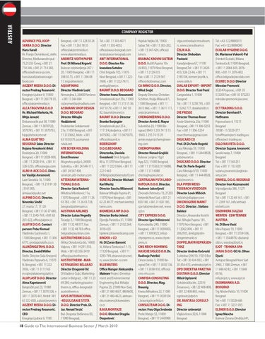 Beograd, +381 11 328 50 24 Fax: +381 11 263 78 35 office@akzentmedia.rs www.akzentmedia.rs ANDRITZ-VOITH PAPER Prof. DI Milorad Krgović Bulevar oslobodjenja 267 / 20, 11000 Beograd, +381 11 398 50 73, +381 11 396 08 11, krgo@beotel.rs AQUAFINING Director Vladimir Lazić Nemanjina 3, 26000 Pančevo +381 13 344 694 cubrumserbia@nadlanu.com ASSMANN SHOP DESIGN D.O.O. BEOGRAD Director Mihajlo Hadžistević Proleterske Solidarnosti 21e, 11000 Beograd, +381 11 3133062, Mob.: +381 63 1033379, assmann@ rvkds.net ATB SEVER HOLDING INTERNATIONAL Ernst Brunner Magnetna polja 6, 24000 Subotica, +381 24 548-111, +381 24 547 498 sever@rs.atb-motors.com ATTENSAM INTERNATIONAL D.O.O. Director Saša Radović Milutina Milankovic 11a, 11070 Beograd , +381 11 26 03 783, +381 11 26 03 728, beograd@attensam.rs AUSTRIAN AIRLINES Director Lukas Negedly Terazije 3, 11000 Beograd, +381 11 32 48 077, Fax: +381 11 32 48 783 office. belgrade@austrian.com AUSTROTHERM D.O.O. Mirka Obradovića bb, 14000 Valjevo, +381 14 291-310, Mob: +381 65 356-3410 office@austrotherm.rs AUSTROTHERM –MARKETINGBÜRO BELGRAD Director Dragomir Ilić DI Vladimir Ćujić, MarketingLeiter in Belgrad , +381 11 23 69 280, marketing@austrotherm.rs, office-beograd@ austrotherm.rs AVUS INTERNACIONAL -REGULISANJE STETA D.O.O. Director Prok. DI. Jur. Nenad Terzić Bul. Despota Stefanova 83, 11000 Beograd,