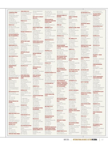 www.logwin-logistics.com LOSBERGER GMBH Matthias Raff Gottlieb-Daimler-Iling 14 74906Bad Rappenau Deutschland 49 7066 980 0 49 7066 980 232 losberger@losberger.com www.losberger.com MACE D.O.O. Branislav Simovic Bul. Mihajla Pupina 6/XXII 11070 Belgrad 381 112200250 381 112200265 www.macegroup.com M+R DICHTUNGSTECHNIK AM SANDBORN 9 Thomas Wolf 63500Seligenstadt Deutschland 49 6182 95670 49 6182 66512 www.mr-profiles.rs MANPOWER D.O.O. Aleksandar Hangimana Bul. Mihajla Pupina 115v 11070 Belgrad 381 11 41 43 093 81 11 41 43 096 office@manpower.rs www.manpower.rs MAS-PROMET D.O.O. Petar Kukic Brace Nastic 12 11272 Beograd 381 11 8465 624 381 11 8467 757 www.maspromet.rs MAŠINOPROJEKT KOPRING Slobodan Lalic Dobrinjska 8a, 11000 Belgrad 381 11 3635 724 381 11 26 43 995 office@masinoprojekt.co.rs www.masinoprojekt.co.rs MEDITERAN FASHION D.O.O. Nikola Milovanovic Milovana Glisica 10 36000Kraljevo 381 36 313 782 381 36 313 782 mediteranf@gmail.com www.mediteranfashion. com MCB EDUKACIJA D.O.O. Bojan Scepanovic Ustanicka 189, 11050Belgrad 381 11 3047 126 381 11 3047 126 www.mcb.rs MEHLER PROTECTIVE SYSTEM Thomas Wolf Zoran Popovic Bagljaš Aerodrom 13187/3 23000Zrenjanin 381 23 532 870 381 23 532 874 mehler@mehler.rs MEIER MECHANIC D.O.O. Andre Meier Industrijska 7 34000Kragujevac 381 34 355 571 meierm@open.telekom.rs www.meier-mechanic.ch MEDINIC EKSPORTIMPORT D.O.O. Ljiljana Belcevic Danicareva 57, 11000 Belgrad 381 11 304 77 44 381 11 283 70 09 www.medicin.com MERCEDES-BENZ SRBIJA I