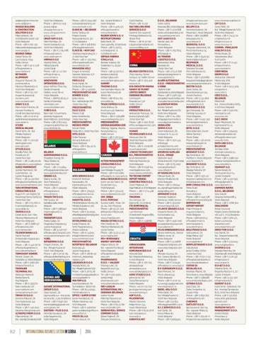 Bul. Zorana Đinđića 71 11070 Belgrade Phone: +381 11 4075 571 office@prista-oil.rs www.prista-oil.rs RUDNIK KOVIN A.D. U RESTRUKTUIRANJU Boba Radić, Dir. Cara Lazara 85, 26200 Kovin Phone: +381 13 741173, rudmik@panet. rs rudnikkovin.com SRPSKA FABRIKA STAKLA A.D. Borislav Vuković, Dir. Staklarska 1-3, 35250 Paraćin, Phone: +381 35 572-622 borislav.vukovic@ serbian-glass.com www.serbian-glass.com SUMMIT TRADING D.O.O. Ivan Gavrailov Kisyov, Dir. Ivana Milutinovića bb 18000 Niš Phone: +381 18 514 104 www.elite.bg TRADE EXPRESS D.O.O. Zorka Kirilova, Dir. Kružni put 40i, Rakovica 11090 Belgrade Phone: + 381 11 2370988 www.tradeexpress.co.rs PREDSTAVNIŠTVO ZASTAVA BUGARSKA OOD Miodrag Zagorac, Repres. Novogradska 24, 11080 Zemun Phone: +381 11 316 5247