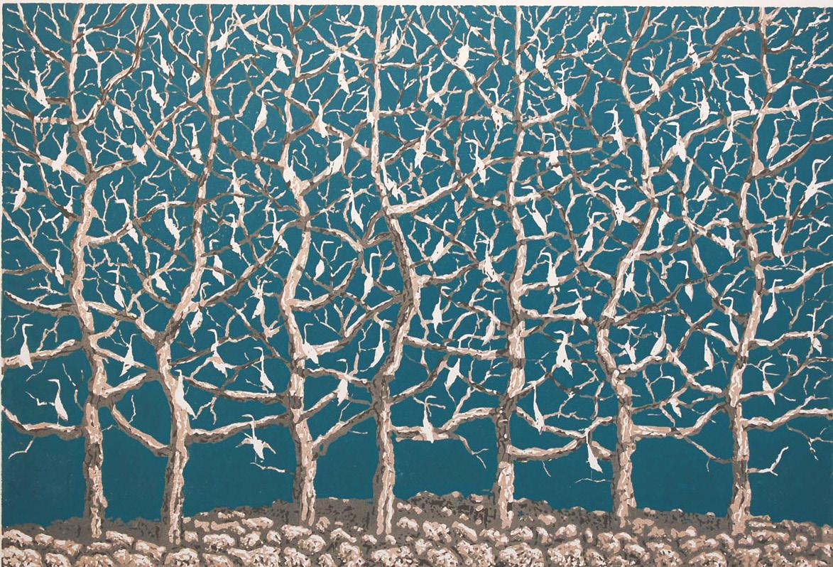 As exemplified in one of his most iconic woodcuts, “Cathedral Forest,” Charles Beck ’48 was inspired by the beauty of the Midwestern landscapes surrounding his hometown of Fergus Falls, Minn.