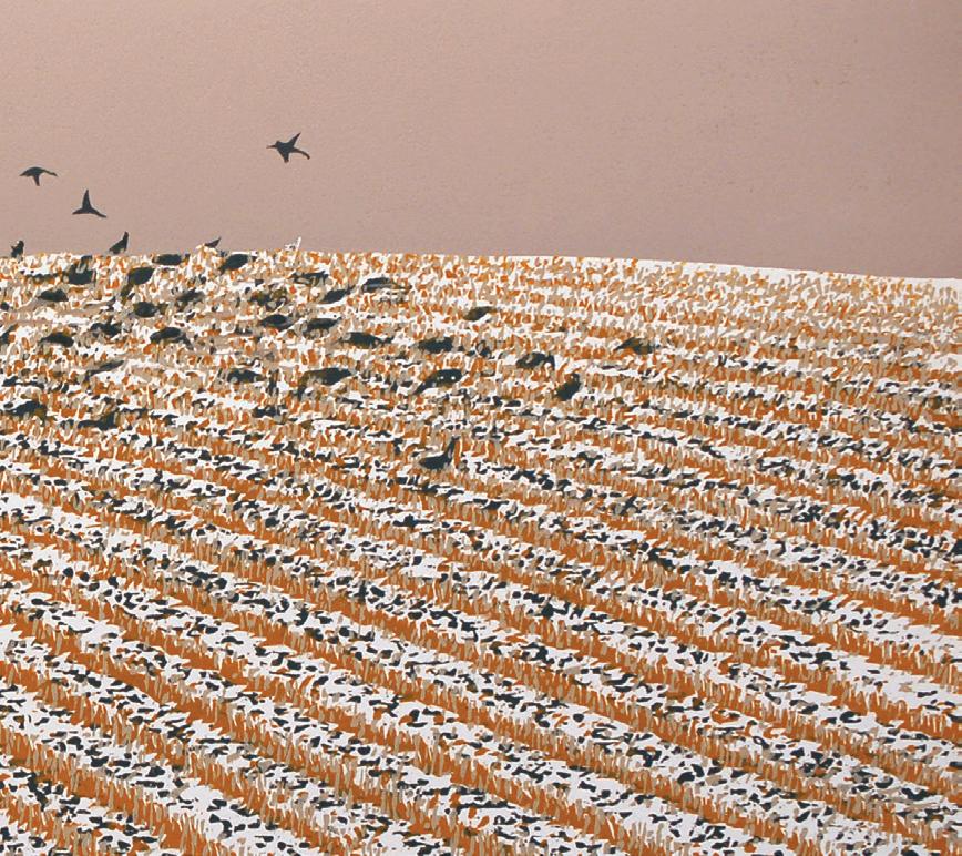 A farmer’s field dotted with migrating birds. Rows of yellow birches against a clear blue sky. A glorious sunset revealed through the trees.