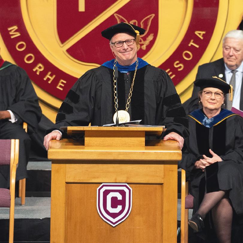 On a beautiful fall day, the Concordia campus buzzes with the anticipation of the 2023-24 academic year. The air is alive with a palpable energy as students make their way to their first classes. Amid the vibrant atmosphere, imagine the Dovre Campanile chimes echoing across the campus, the serene flow of the fountain in Prexy’s Pond, and the sense of excitement as you settle into your seat for your inaugural class as a Cobber. Suddenly, you realize that the person sitting beside you isn’t a fellow first-year student but Concordia’s new president, Dr. Colin
