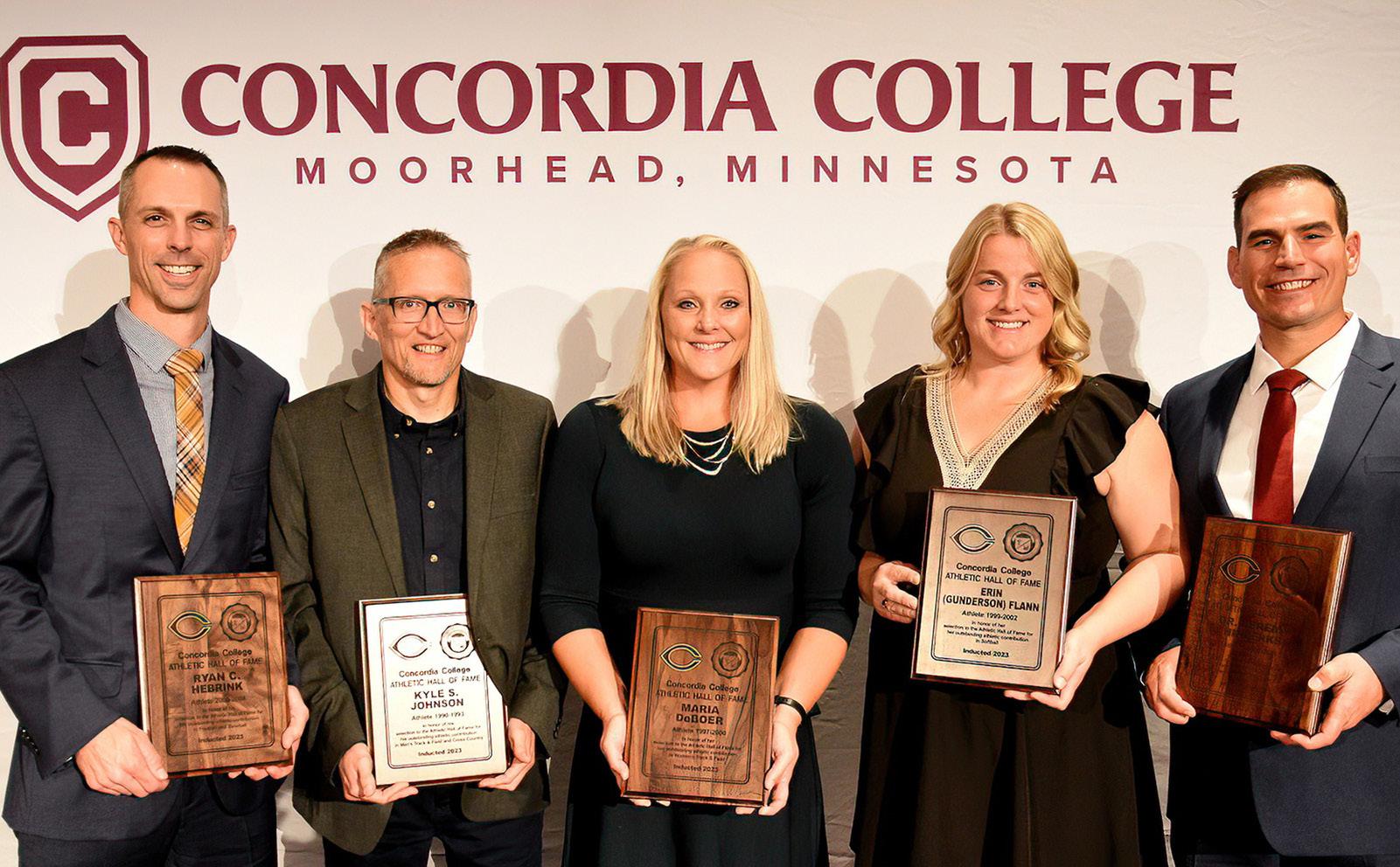 Concordia inducted five standout former student-athletes into the Athletic Hall of Fame. The 2023 inductees include: Maria DeBoer ’00, a five-time All-American and MIAC champion in women’s track and field; former Cobber pitcher Erin (Gunderson) Flann ’02, the only two-time NFCA Midwest All-Region award winner in Cobber softball history and among only a few players to earn back-to-back MIAC All-Conference honors; Ryan Hebrink ’04, a standout two-sport athlete who earned MIAC All-Conference honors five times in football and baseball; Jeremy Hinderks ’04, a powerful force for the Cobber football and baseball teams in the early 2000s and the only player in the history of the baseball program to be named MIAC Pitcher of the Year; and Kyle Johnson ’93, an AllAmerican two-sport athlete for the Cobber track and field and cross country teams.
