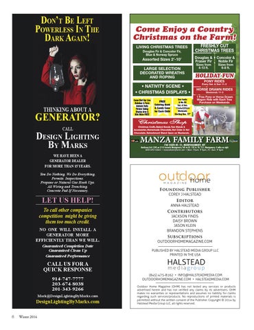 (845) 475-8162 • INFO@HALSTEADMEDIA.COM OUTDOORHOMEMAGAZINE.COM • HALSTEADMEDIA.COM Outdoor Home Magazine (OHM) has not tested any services or products advertised herein and has not verified any claims by its advertisers. OHM makes no warranties or representations and assumes no liability for claims regarding such services/products. No reproductions of printed materials is permitted without the written consent of the Publisher. Copyright © 2014 by Halstead Media Group LLC, all rights reserved.