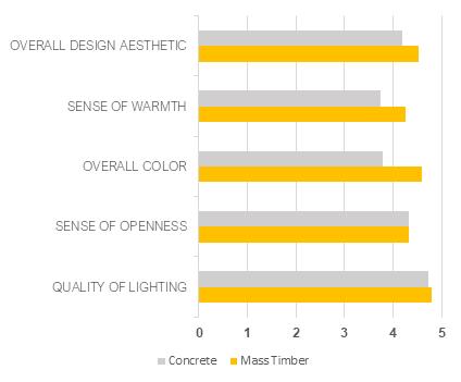 Using wood in haptic user experience elements, such as door handles, elevator fit outs, and furniture, has been shown to create calming and favorable reactions.6 Scientifically, this may be caused by the lower thermal conductivity of wood as a material, compared to steel or concrete, which makes the temperature of the wood closer to the temperature of the surrounding space.6 Research shows that respondents connect with wood mostly through its distinctions, such as contrast, color, knots, and texture.7 This is especially noted in wood that has a natural finish, as opposed to deep staining.7 Due to its aesthetic value over concrete and steel, wood structures can increase property value, especially in exposed applications. Research has shown that yellow tones increase the sense of warmth within user experience and increase favorability.