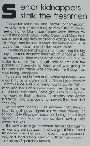 When Mrs. Remiger ‘98 was a freshman, she had to wear a pig nose. Her week was “full of not knowing where to go along with being unable to use certain stairwells to get to different places. It was scary and not very welcoming...