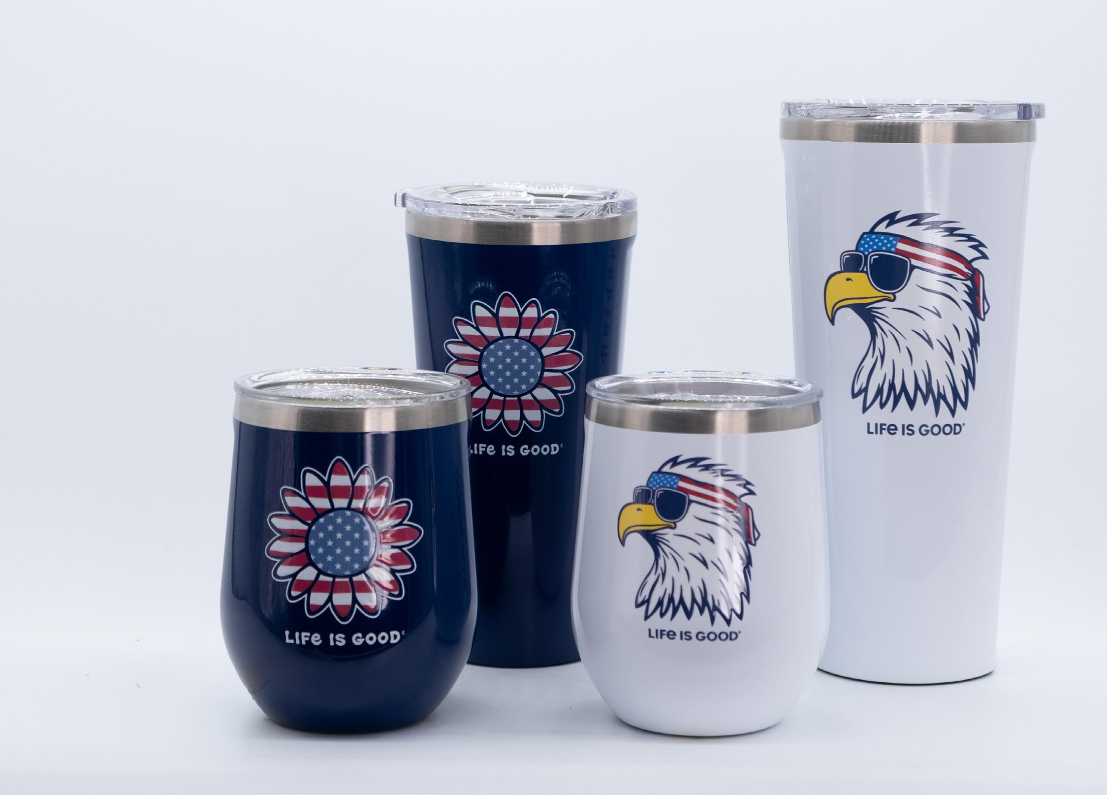 These new Americana designs sit atop Gloss Navy or Gloss White and are available on our bestselling triple-insulated Stemless and Tumblers in celebration of our 250th Anniversary of the United States.