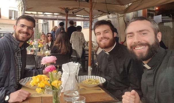 (L) Thomas having a meal with other Lansing seminarians in Rome, (R) Charlie and Mason in the St. Paul Cathedral in St. Paul, Minnesota.