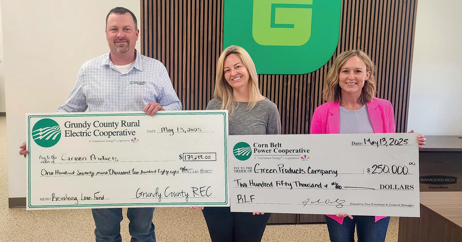 Grundy County REC and Corn Belt Power partnered through their Revolving Loan Funds to support Green Products Company in its latest expansion. Grundy County REC closed a loan May 13 for $179,287, while Corn Belt Power provided $250,000— helping to fund the company’s ongoing growth and facility improvements.