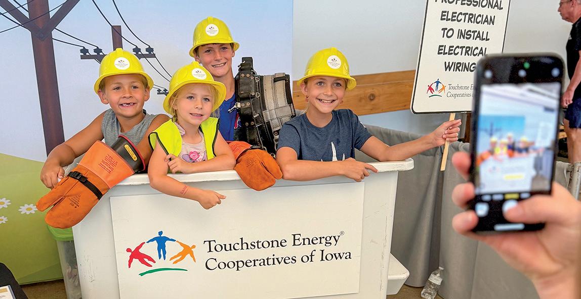 Electric co-op staff from across the state handed out plastic hard hats with Touchstone Energy Cooperatives of Iowa stickers on them and suckers to kids. Kids could also try on select line worker safety gear and take fun photos in our co-op safety selfie station.