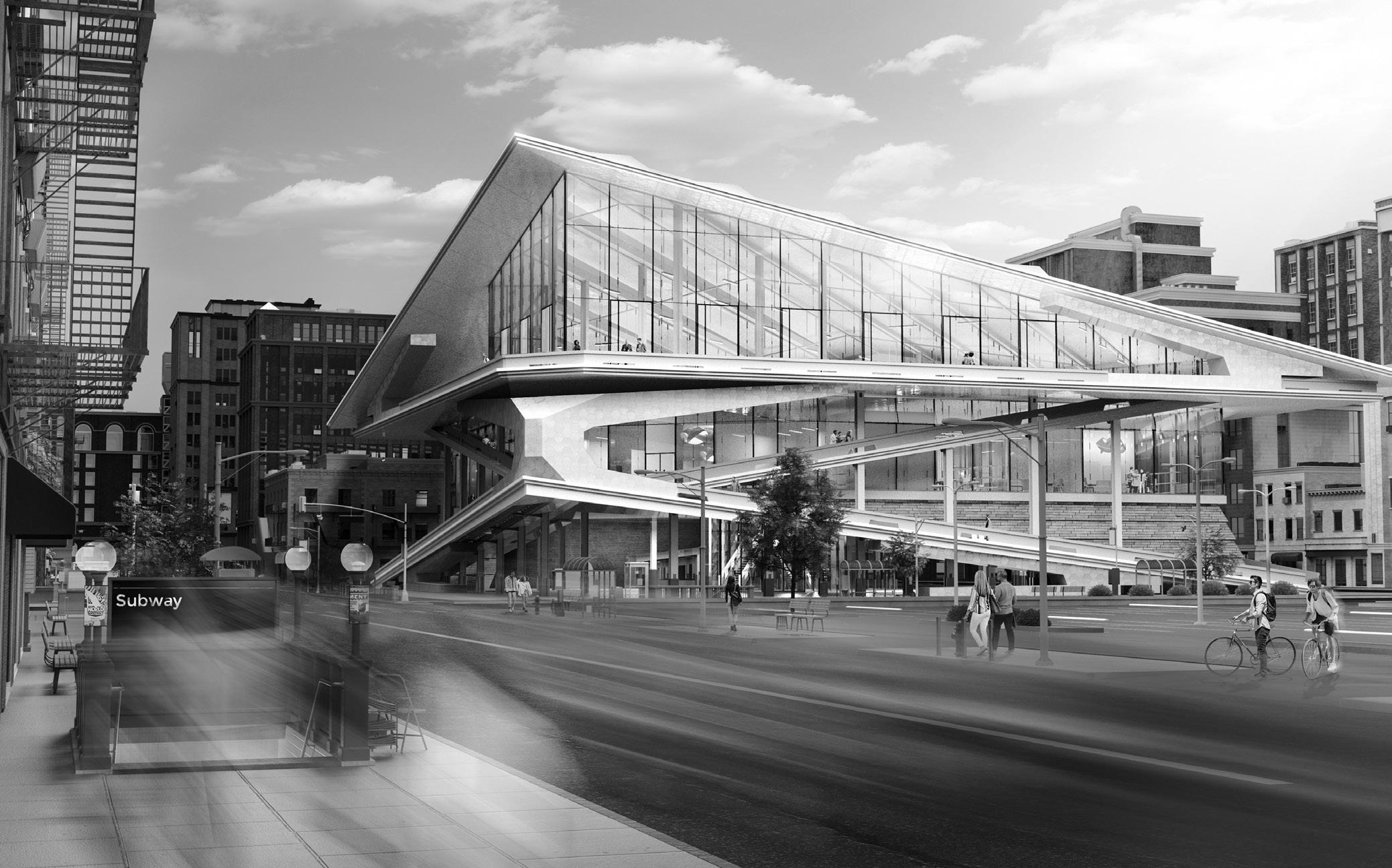 The skyward-pointing, planar roof rests on two of the ramp’s sculpted volumes and acts as the final “zag” in the building’s zigzagging silhouette. The lifted plane creates an open and airy space for reading and conversing. Spacious and open reading rooms, meeting rooms, and offices fill the floor below, all with access to tall windows. The ground floor is largely open to walking traffic, framing the adjacent avenue’s markets and bodegas. Storage, archives, and a small auditorium are located in the basement, which is also accessible via a continuation of the exterior ramps or interior elevator core.