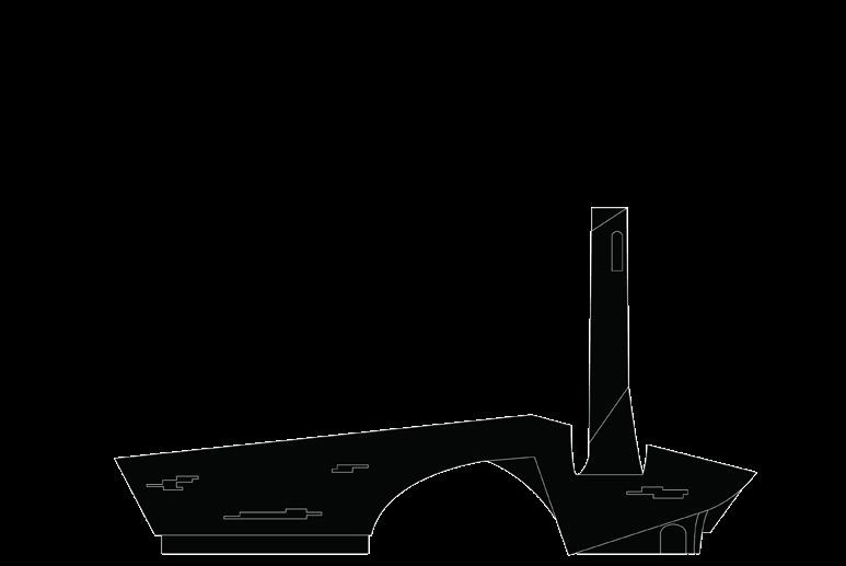 The Watkins Glen building plays upon the multitude of adjacent vineyards in the hills above it. The program is a new winery and tasting room that sponsors and samples the local flavors. Across the building’s arch is a small visitor center and access to the overlook tower. Here, visitors can gain a stunning view of the village, Lake Seneca, and Watkins Glen Park. The Montour Falls building slices away roof and wall to create a moderatelysized open-air theater. The locals of Montour Falls take immense pride in their musical and theatrical productions which are tied to the history and growth of the village. The steeple here is not an accessible tower, but a light-collecting illumination device for the performers and a lightreflecting device to announce that a performance is underway.