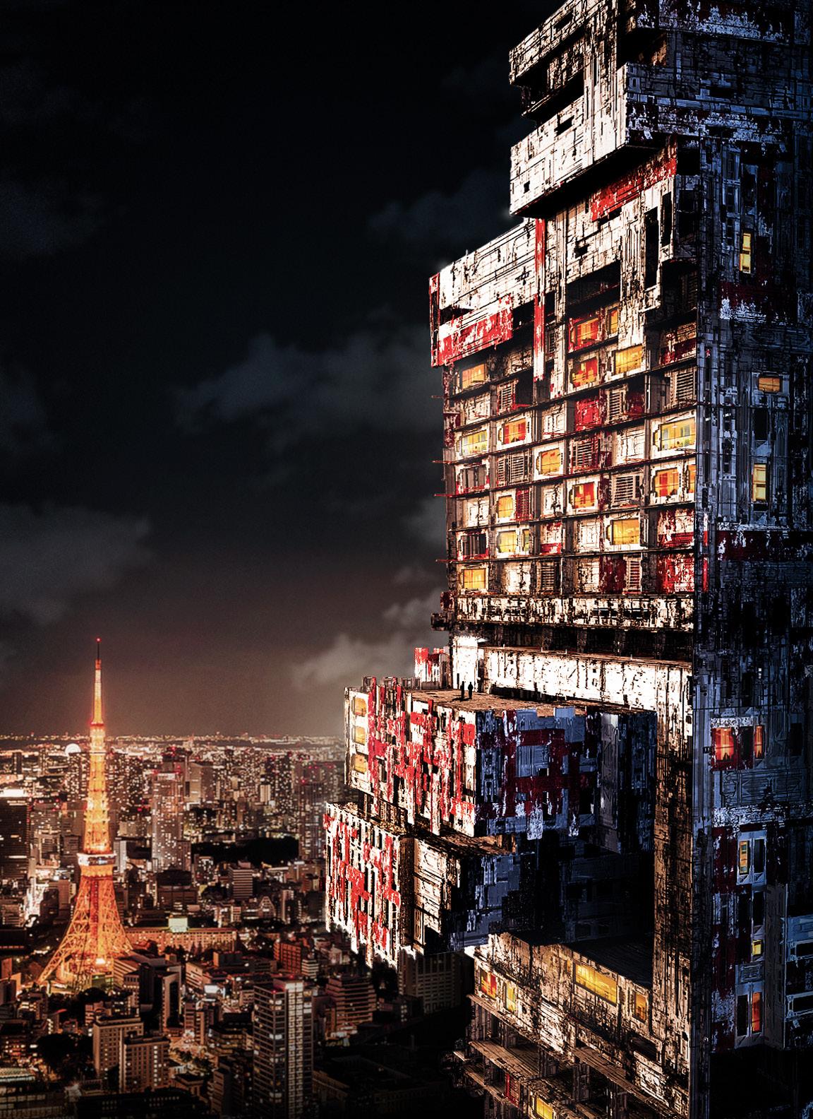 This tower behaves antithetically to many of its neighbors. While the majority of the architecture in Shibuya is adorned with strobing LCD advertisements, this building turns its digital persona inwards, towards its inhabitants. Rooms and terminals in the building lead to zones of digital interaction, some for one and some for one-thousand. The building’s complex and fragmented silhouette is its own statement, in direct contrast to many of the blocky skyscrapers adjacent to it. Comprised of the massive, painted and worn hulls of recycled Japanese cargo-ships the exterior mimics the digital noise of Shibuya Crossing, but its real screens and monitors are subject to the curiosities and attentions of those who explore and those who dwell within.