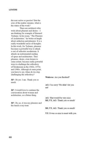 the user active or passive? But the crux of the matter remains, what is the status of the work? There are architects who write about pleasure and desire – I am thinking for example of Bernard Tschumi. In his essay, “The Pleasure of Architecture,” he writes at length about seduction and pleasure. It is a really wonderful series of thoughts. In this work, for Tschumi, pleasure becomes a powerful way to attack a sort of orthodox modernism. It attacks an instrumental reading of space and architecture. Thus pleasure, desire, even leisure to some extent, become really powerful ways to challenge the orthodoxy of Modernism in the 1960s, 1970s and 1980s. Although at some point, you have to say, when do we stop challenging the orthodoxy? BP: Oh yes. I am. Thank you so much. BP: I would love to continue the conversation about women and architecture, as a future thing. BP: Oh, no, it was my pleasure and the lunch is my treat.