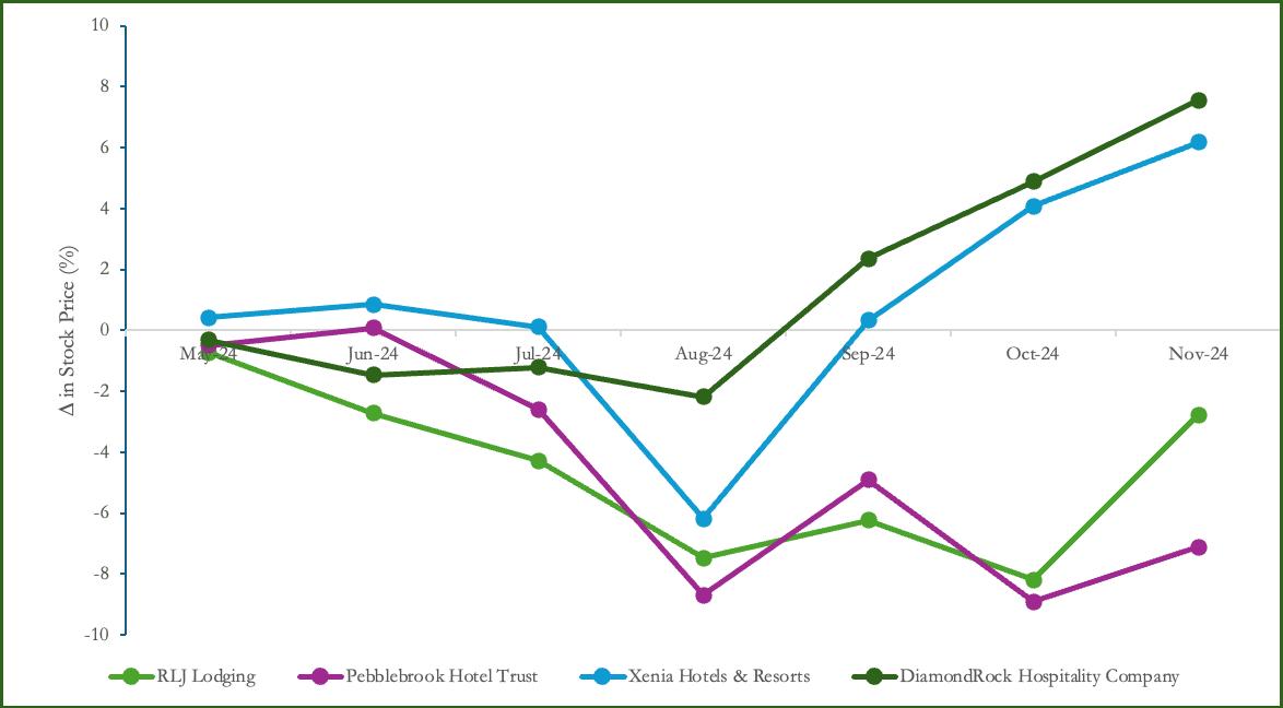 Coming off of Q3, hotels and hotel REITs underperformed. From the Dow Jones Equity REIT index, the hotel sector return was only a YTD return of 18 3%, with a QTD return of 9 9% This can be attributed to a few factors; according to CBRE, the expected summer travel spike did not materialize in 2024, causing Q3 to experience a 0 8% occupancy decline and a 0 2% decline in RevPAR