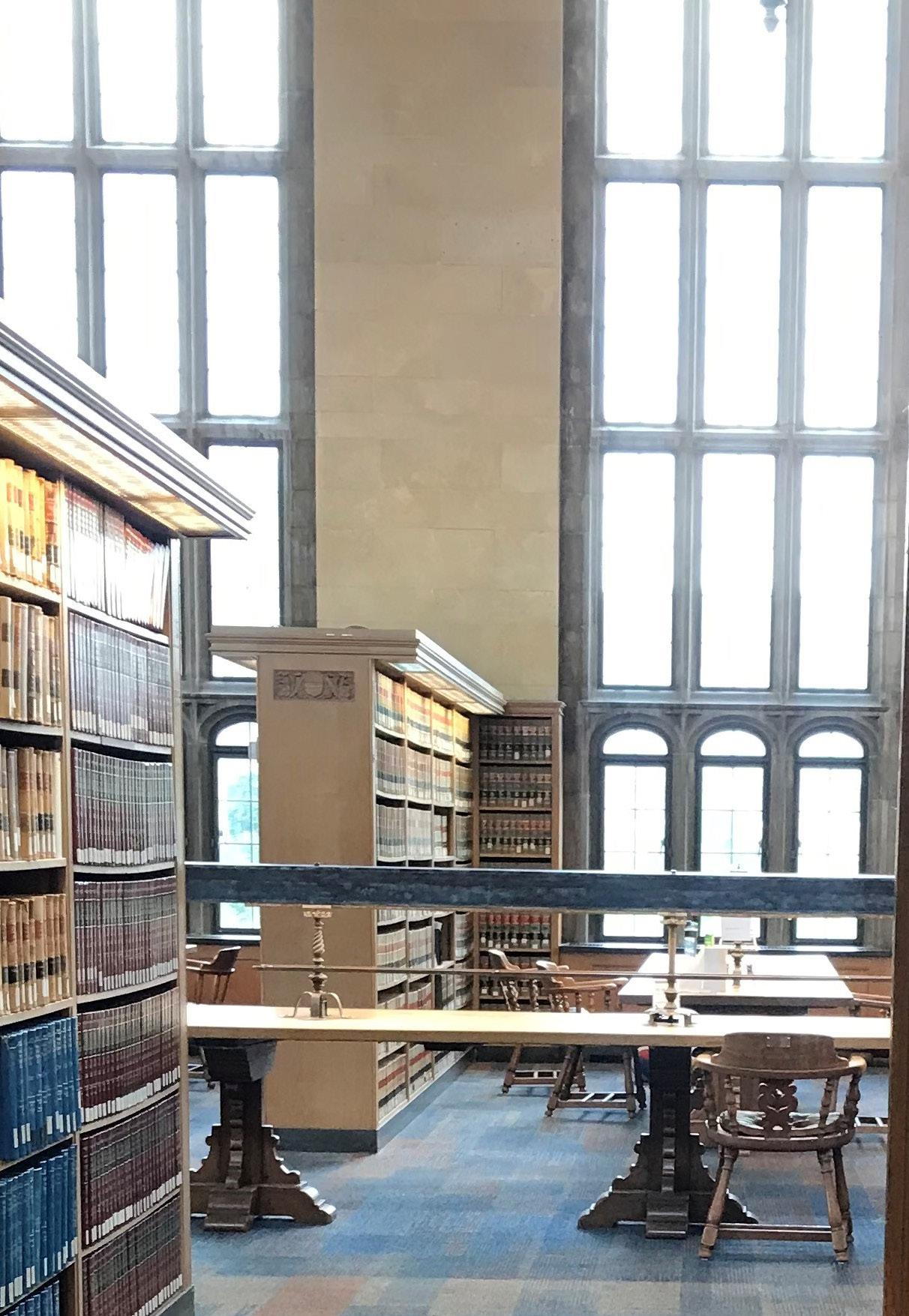 Preparing the physical library for a socially-distanced school year was a major undertaking that required constant pivoting, invention, and reinvention. While over 400 seats are available during normal operations, social distancing re quirements reduced the number of seats available to about 100. A dedicated team of library workers numbered, labeled, and added each available seat to an online seat reservation system. At the same time the team either taped off or moved each unavailable chair. Masses of chairs were used to block off areas that could not be used. Signage was placed on all seven floors of the li brary, and renewed repeatedly in response to evolving policy and guidance. Policies for use of space evolved and changed as well, while we worked cre atively with Law School colleagues to ensure sufficient online learning and study space.