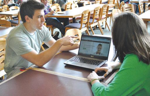 The bull and the bear | Freshman Luke Hagy shows off Endorse me, a website that looks to connect qualified students to fir ms on Wall Street with the hopes of finding them job opportunities, to a Cor nell classmate