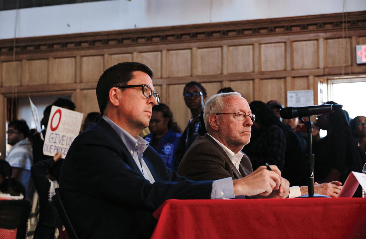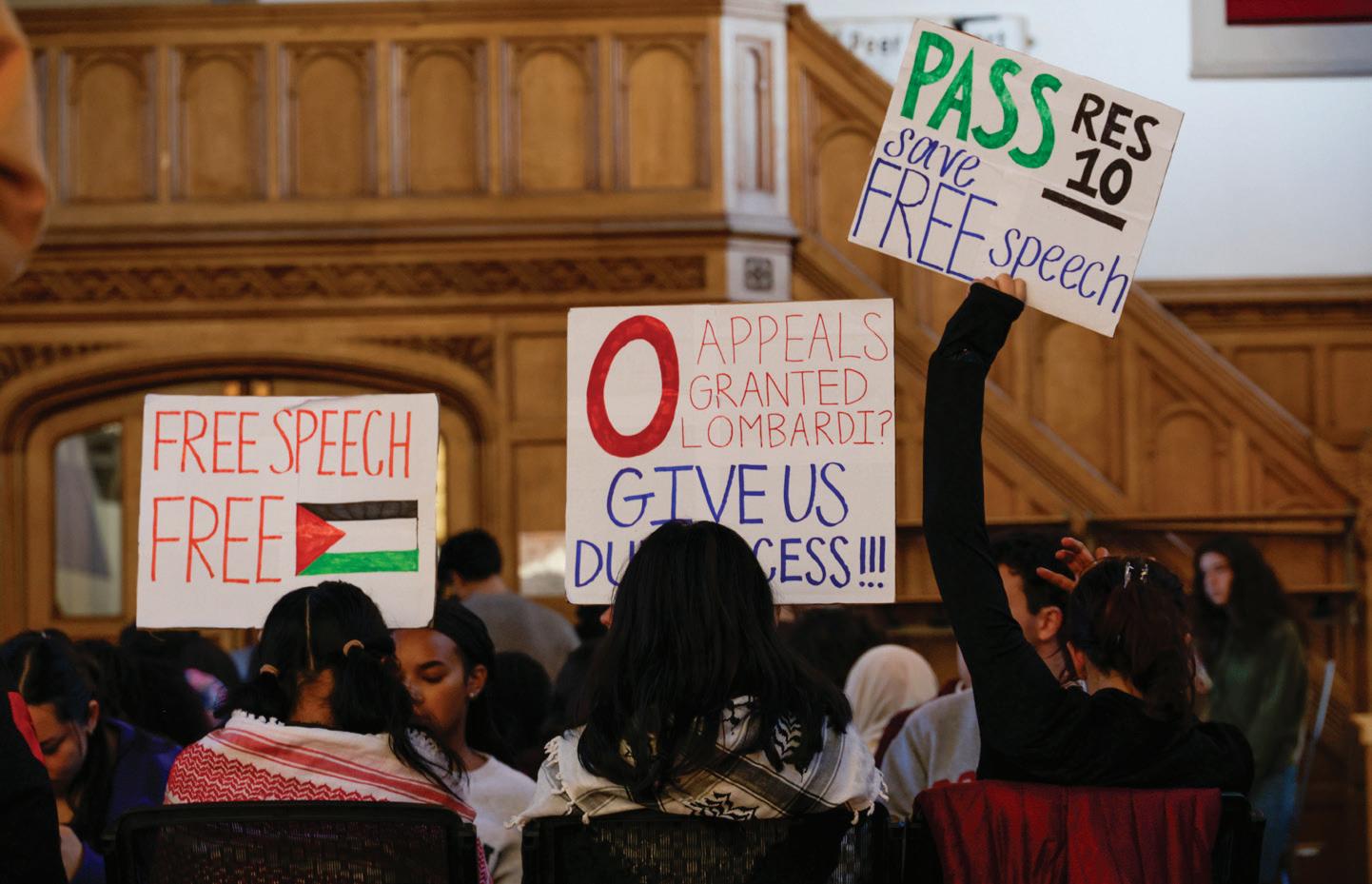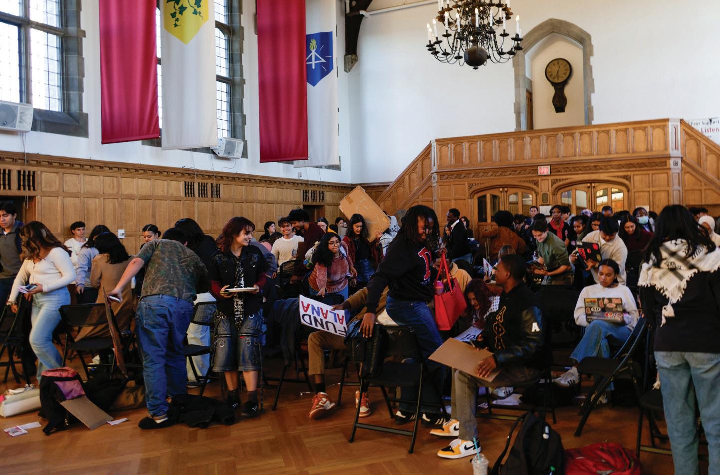 When Kotlikoff and Lombardi walked into the room, the crowd erupted into a flurry of motion and noise as attendees picked up and turned their chairs to face away from where the administrators sat. Attendees standing along the walls also turned their backs on administrators. Many attendees held signs facing Lombardi and Kotlikoff in support of Resolution 10, ALANA, free speech, Palestine and more.