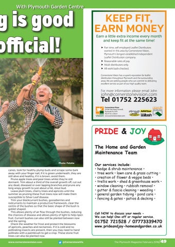 canes, look for healthy plump buds and scrape some bark away with your finger nail, if it is green underneath, they are still alive and healthy, if it is brown, avoid them. Prune apple trees and pear trees whilst they’re still dormant. Trim about a third of the overall growth off, cut out any dead, diseased or over lapping branches and prune any long wispy growth to just about a fat, stout bud. Leave plum trees, cherry trees and apricots until the summer as pruning these fruit trees now will make them susceptible to Silver Leaf disease. Trim your blackcurrant bushes, gooseberries and redcurrants to maintain a productive framework, clear the centre of the bushes so that the basic shape of the bush is goblet shaped. This allows plenty of air flow through the bushes, reducing the chances of disease and allows plenty of light to help ripen fruit. Currant bushes can also still be planted between now and the spring. Check the weather for frost and protect the blossoms of apricots, peaches and nectarines. If it is cold and no pollinating insects are present, then you may need to hand pollinate with a paintbrush to get a crop. These stone fruit trees can also be planted now. www.cornerstonevision.com