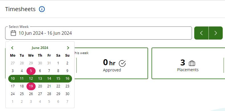 From the Timesheets page (this appears on the right), click to select which week you want to record hours for.