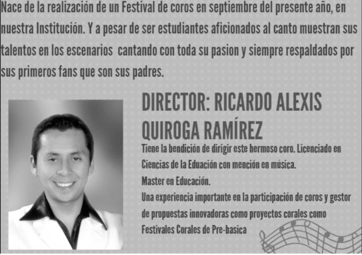 Dirigido por el maestro Ricardo Quiroga tiene la bendición de dirigir este hermoso coro. Licenciado en Ciencias de la Educación con mención en música. Master en Educación. Experienca relevante en la participación de coros y gestor de propuestas innovadors como proyectos corales dentro de las instituciones de Pre-Básica.