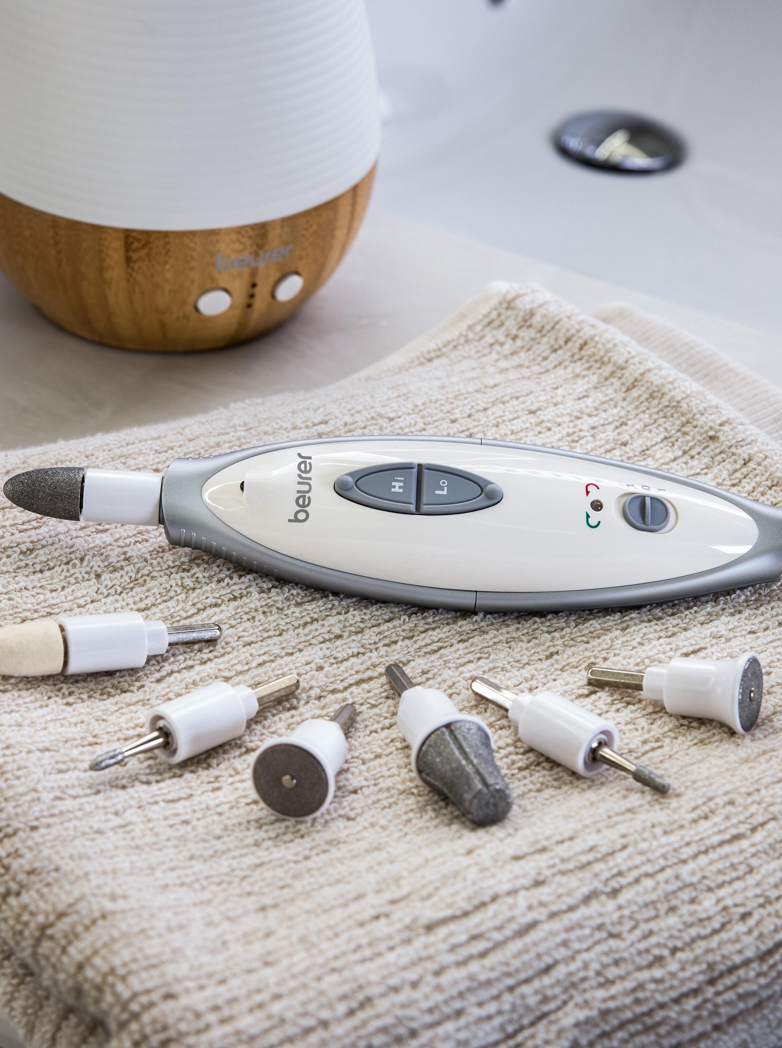 7 accessori di qualità: lima in zaffiro, lima in feltro, disco in zaffiro a grana fine, disco in zaffiro a grana grossa, fresa a fiamma, fresa a cilindro, lima per calli in zaffiro.