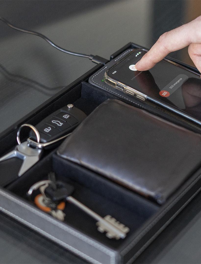Pratico svuota tasche hi-tech multifunzione: contiene tutti gli oggetti di uso quotidiano e ricarica lo smartphone, nell’apposito pad di ricarica wireless Qi, alimentato tramite cavo USB TYPE-C incluso nella confezione (per i dispositivi che lo supportano).