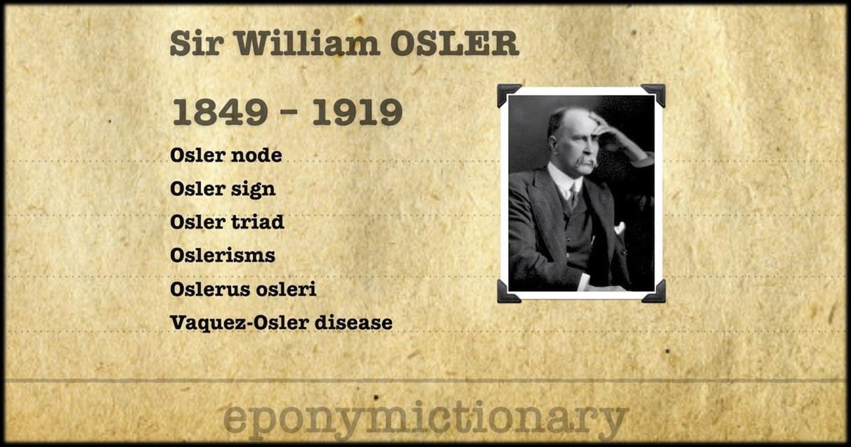 Sir William Osler, 1st Baronet, FRS FRCP; (1849 – 1919) was a Canadian physician and one of the four founding professors of Johns Hopkins Hospital. Osler created the first residency program for specialty training of physicians, and he was the first to bring medical students out of the lecture hall for bedside clinical training. He has frequently been described as the Father of Modern Medicine and one of the "greatest diagnosticians ever to wield a stethoscope." Osler was a person of many interests, who in addition to being a physician, was a bibliophile, historian, author, and renowned practical joker. One of his achievements was the founding of the History of Medicine Society of the Royal Society of Medicine, London. -Wikipedia