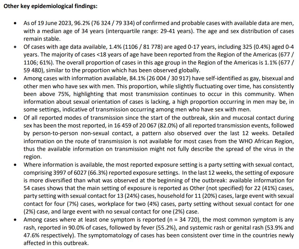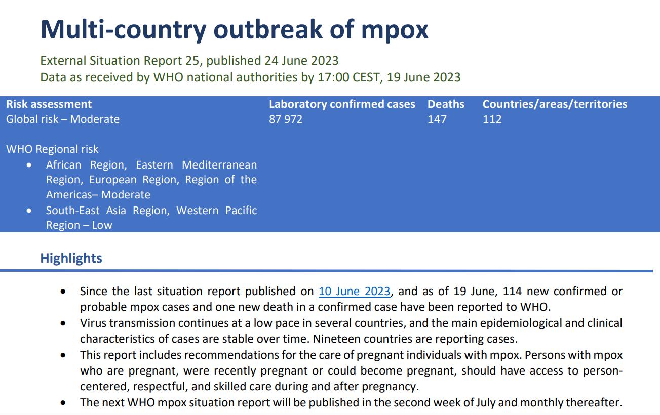 What follows are excerpts from the WHO on the current multinational mpox (monkeypox) outbreak. The primary reference is “Multi-country outbreak of mpox: external situation report 25” published on 24 June this year1 .