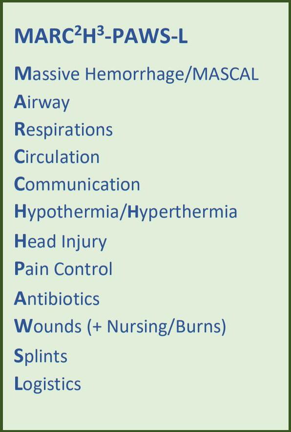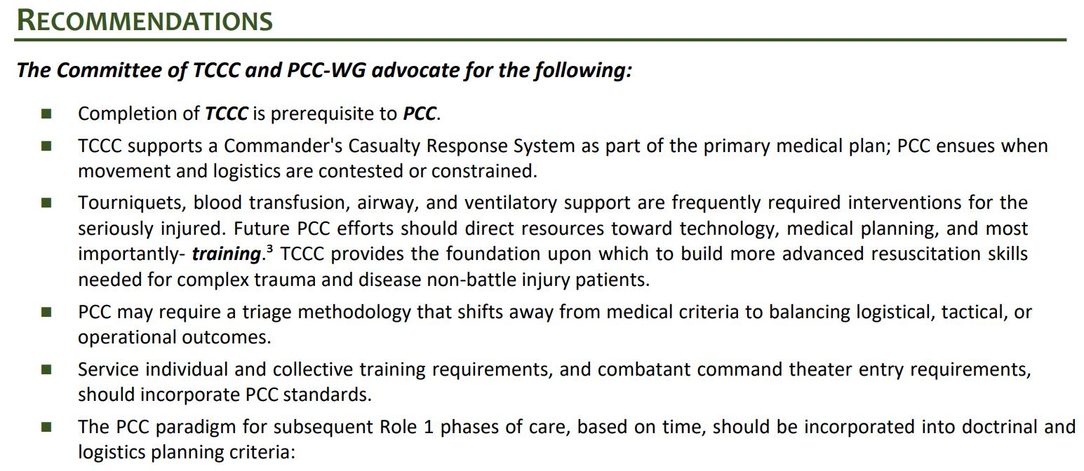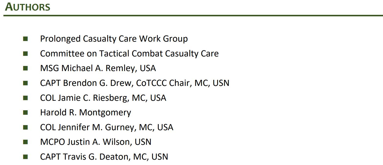 This most recent consensus statement was penned by the Committee on Tactical Combat Casualty Care and the Prolonged Casualty Care working group, and emphasizes the adage “There is no PCC before TCCC,” meaning the primary assessment and immediate threats to life must be addressed before moving into the prolonged casualty care (PCC) phase.