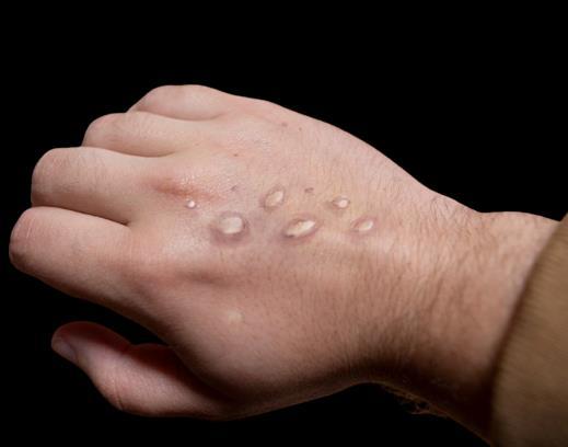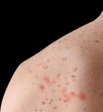 Benign manifestations of mpox are characterized by a centrifugal and vesicular rash plus fever and myalgia; severe cases of mpox may also present with skin exfoliation (similar to partial thickness burns), necrotizing soft tissue infection, pyomyositis, cervical adenopathy, ocular lesions, pneumonia, ARDS, severe dehydration, sepsis and septic shock, and encephalitis.