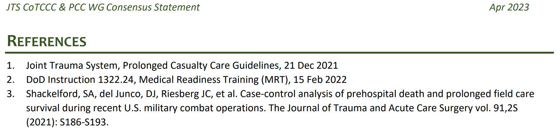 In April of 2023 a consensus statement was published on the U.S. Joint Trauma System’s website (https://jts.health.mil/). The JTS is an excellent repository of field clinical practice guidelines ranging from mechanical ventilation to snakebite treatment to setting up a walking blood bank.