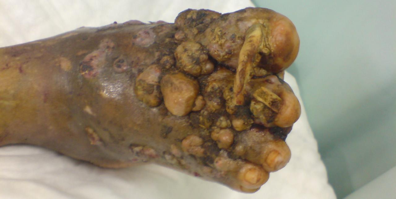 Examination shows a woody indurated nonmobile foot that had insensate patches and spicules of parts of the bone that had been devitalized.